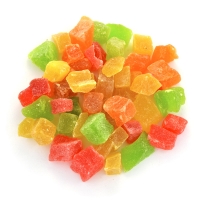 Цукаты «Ананас – кубики» в размерном ряду 8-10 мм производятся в окраске из четырех цветов. Это ингредиент натурального происхождения, производимый методом консервирования в сахарном сиропе долек очищенного ананаса. Сырье выращивают в Таиланде, там же производят цукаты. Корочка на поверхности цукатов предохраняет продукт от порчи, сохраняет кубики сочными и в меру влажными. Крупные фракции цукатов как нельзя лучше раскрывают весь аромат и вкус не только внутри кондитерских или хлебобулочных изделий, но и на их поверхности. Ингредиент цукаты «Ананас – кубики» отличный выбор для производства самой натуральной выпечки, сладостей, десертов и фруктовых конфет.